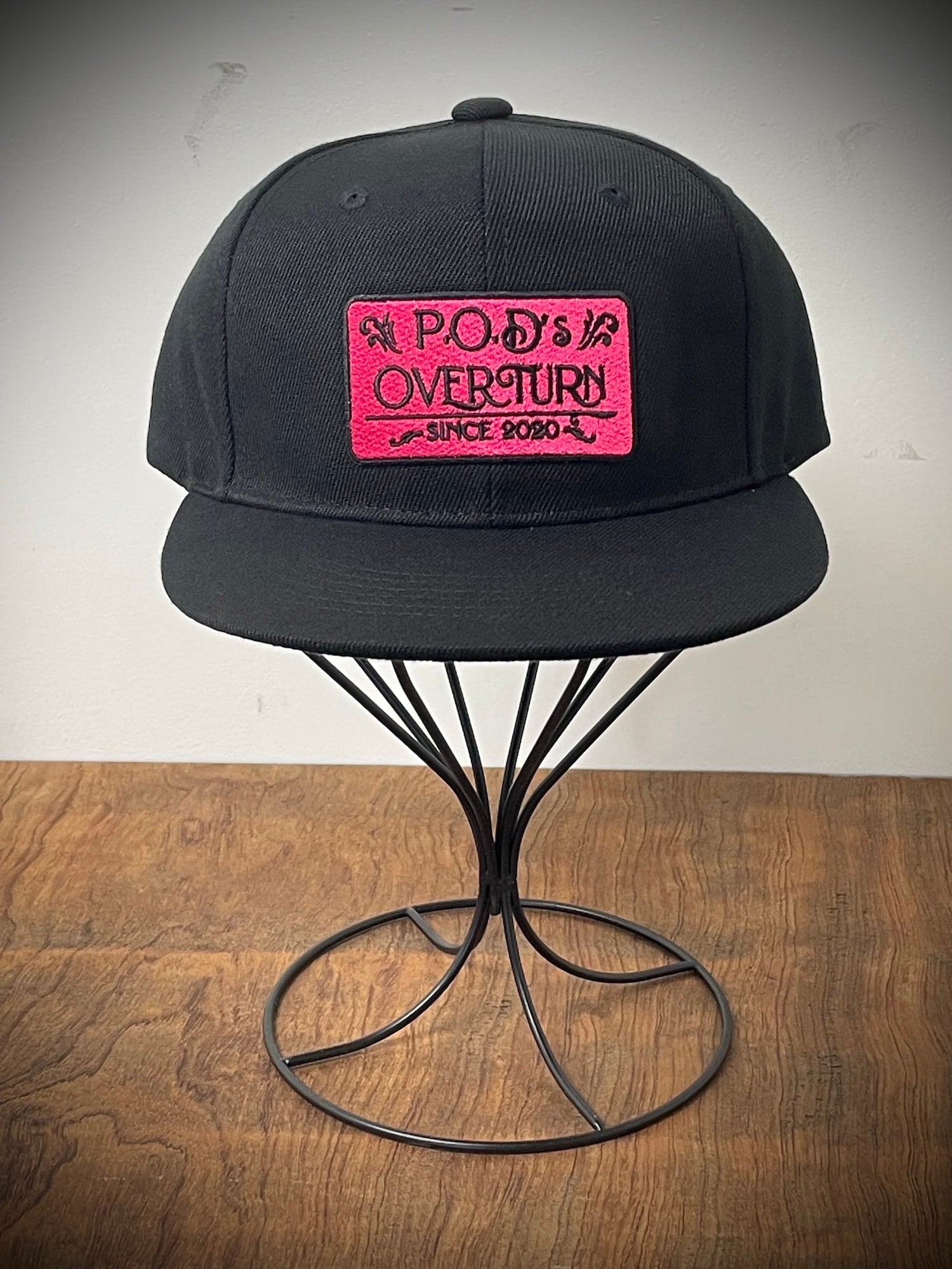 合わせやすいブラックボディに差し色の紅赤がインパクトのフラットバイザーキャップ。